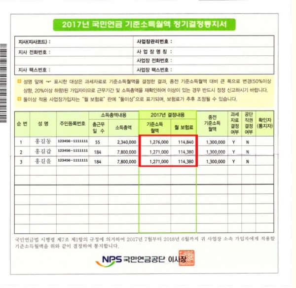 이는 2017년도 7월 급여 부터 국민연금을 변경해야 함을 알려주는 통지서입니다.