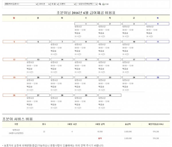 급여제공 비용표 예시 :