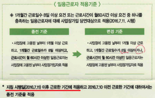 시행시기 : 2016.07.11 이후부터 적용 ( 따라서 7/11 전에 근무한 일용직(가족케어)은 종전규정이 적용됩니다.)
