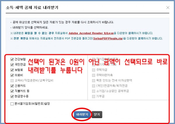3. 소득*세액공제 자료 조회에서 모든 자료 조회후 "한번에 내려받기" 클릭!!