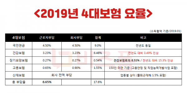 2019년도 4대보험 요율 (급여대장 건강보험 요율 인상 반영)