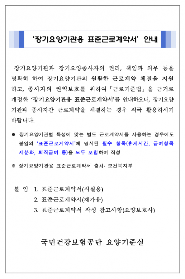 장기요양기관용 표준근로계약서(보건복지부) 및 상호협력동의서 안내