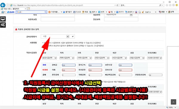 2. 직원을 등록시 급여산정방식에서 시급을 선택후 직원별 시급을 설정을 해주세요
