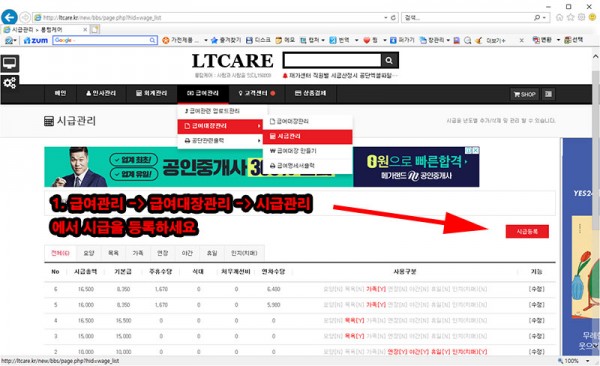 1. 급여관리 -> 급여대장관리 -> 시급관리  에서 시급을 등록하세요