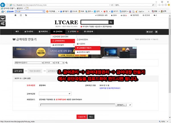 3.​ 급여관리 -> 급여대장관리 -> 급여대장 만들기 에서 공단파일을 업로드하여 만드시면 됩니다.​