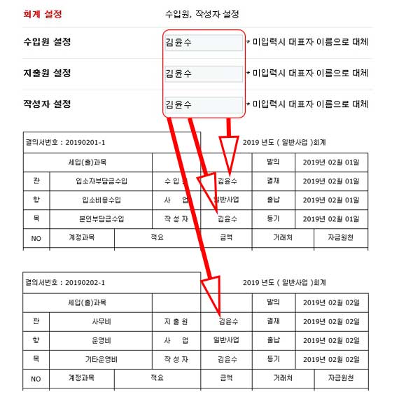 각 회원의 정보수정에서 회계설정 부분의 수입원, 지출원, 작성자 부분을
