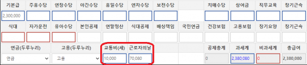 급여대장 과세항목 교통비/근로자의날 수당 추가안내